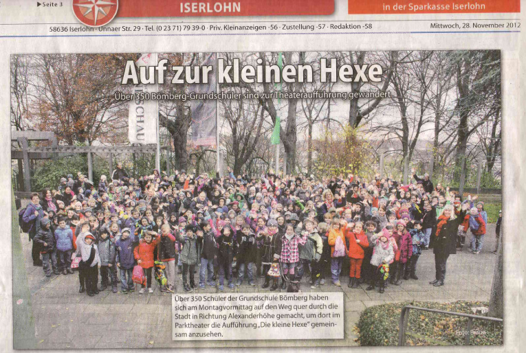 | Iserlohner Kreisanzeiger 27.11.2012 – Nachgedacht Eine Stadt mit Zusammenhalt Johannes Josef Jostmann hat in seinem langen Leben als Theaterdirektor schon eine Menge erlebt. Er hat mit allerhand Profis und Theatergrößen zusammengearbeitet, und es gibt wohl nicht viel, was ihn noch aus den Socken haut. Gestern Morgen hat er sich aber innerlich sehr tief verbeugt und den Hut gezogen – vor den Männern vom IBSV-Spielmannszug. Die hatten es sich nämlich allesamt nicht nehmen lassen, einen Tag Urlaub zu nehmen, nur um für die Kinder aus Iserlohn bei der „Kleinen Hexe“ mit Trommeln und Pfeifen echtes Schützenfest-Feeling auf die Parktheater-Bühne zu zaubern. „Wo gibt’s denn sowas?“, fragte sich Jostmann und gab auch gleich die passende Antwort: „In einer Stadt mit Zusammenhalt.“ von Ralf Tiemann |