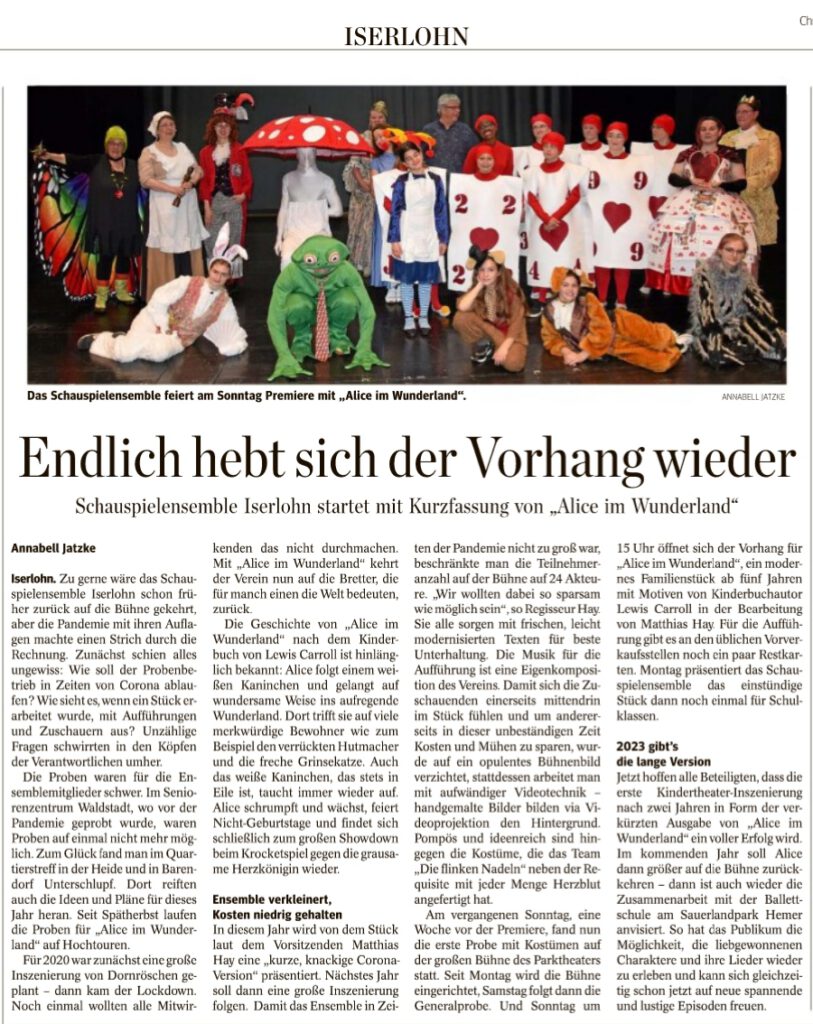Dies alles ist natürlich auch Teil dieser Version des Kinderbuchklassikers. Natürlich mit vielen lustigen Einfällen, einer modernen Sprache und viel Musik – so wie man es vom Schauspielensemble Iserlohn kennt. Aber etwas ist anders. Nach zweijähriger coronabedingter Pause zeigt das Schauspielensemble Iserlohn als erste Kindertheater-Inszenierung eine verkürzte Ausgabe von Alice im Wunderland. Durch die besondere Erzählweise werden kleine und große Zuschauer nichts vermissen. Versprochen! 2023 wird das Stück dann ein zweites Mal in einer großen Inszenierung gezeigt. So hat das Publikum die Möglichkeit, die liebgewonnenen Charaktere und ihre Lieder wieder zu erleben und kann sich gleichzeitig schon jetzt auf neue spannende und lustige Episoden freuen!